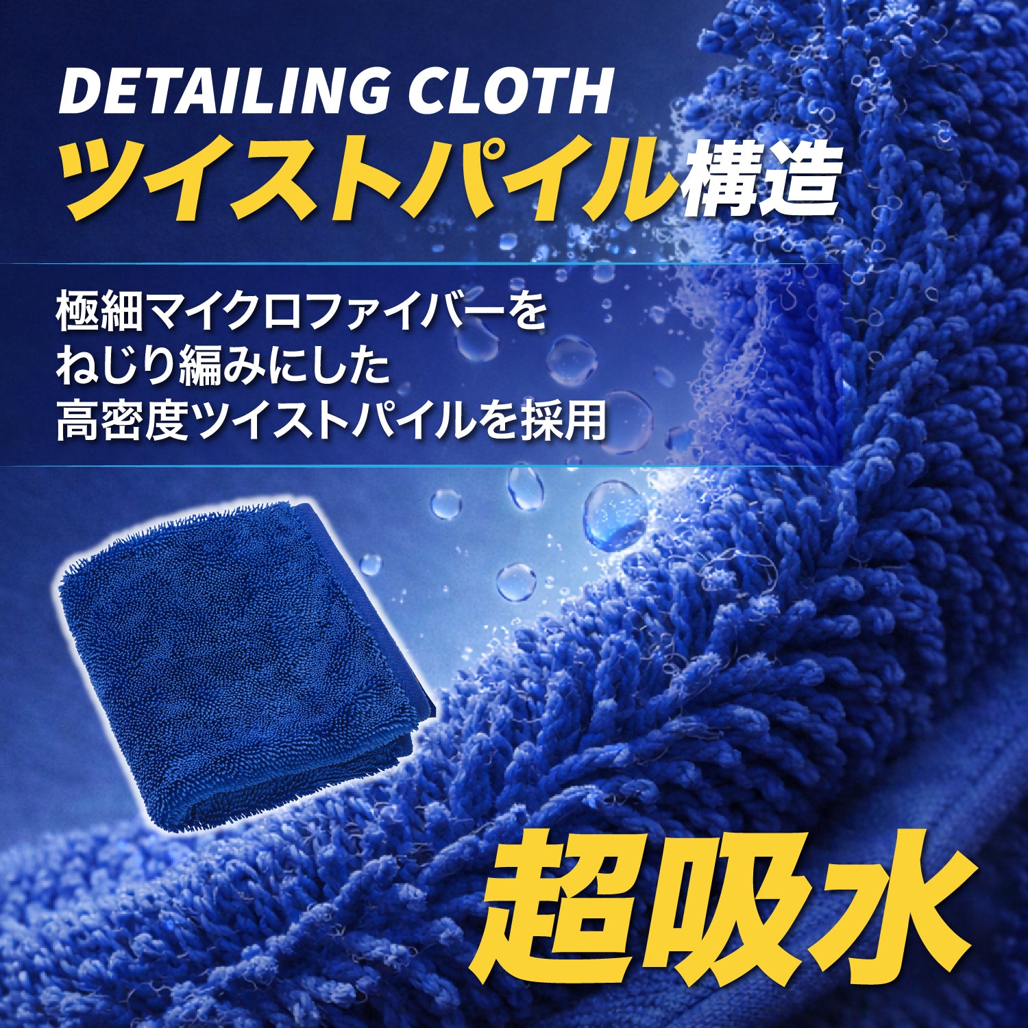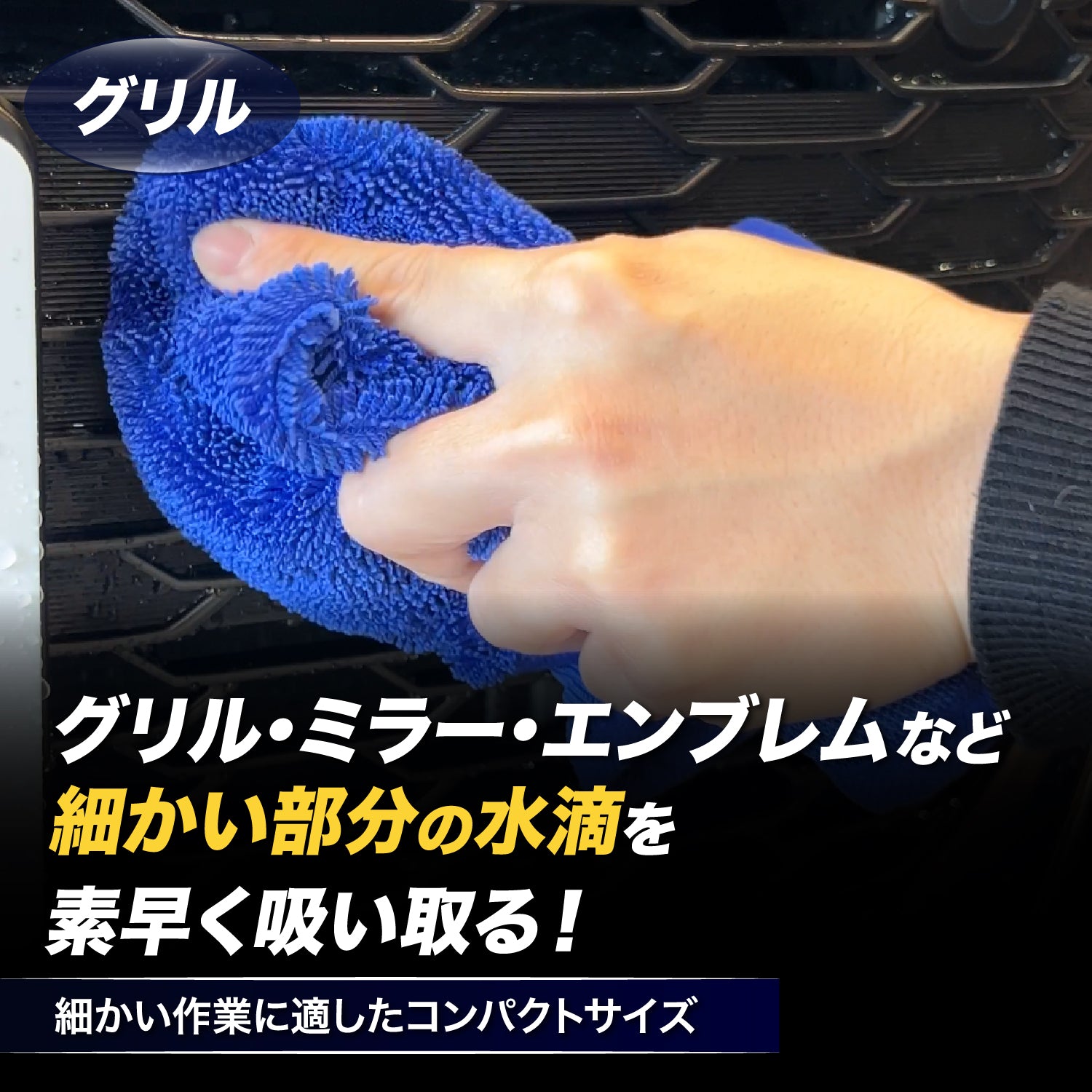粗拭き後、水滴が残りやすいボディの細部(ミラー下・エンブレムまわり・グリルの隙間など)に毛足の長い面を当てて、水滴を吸わせるように拭き取ります。