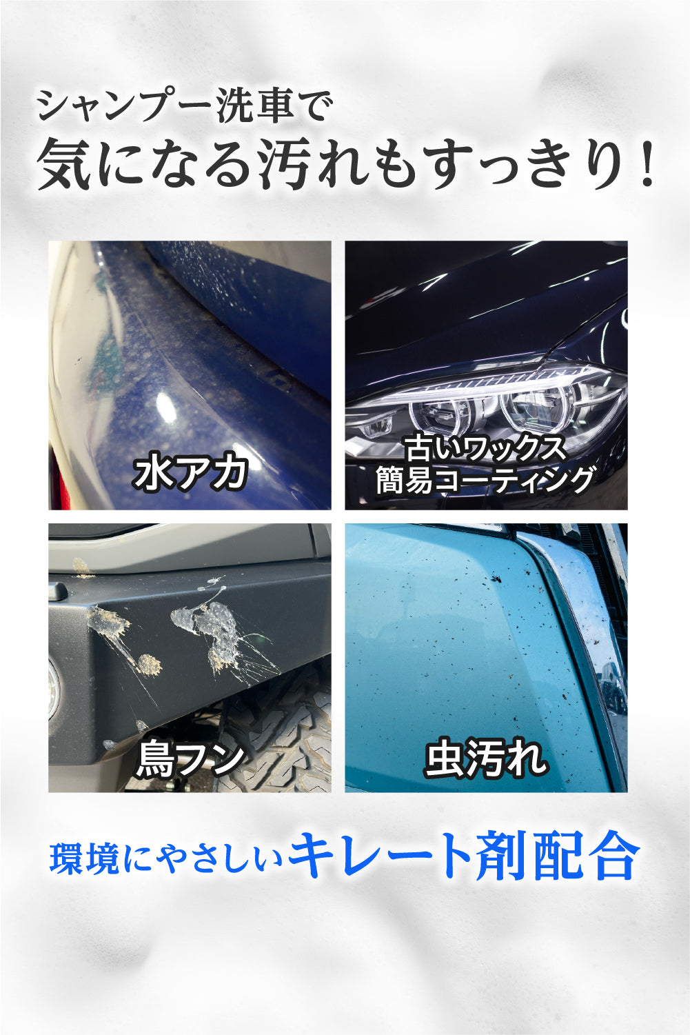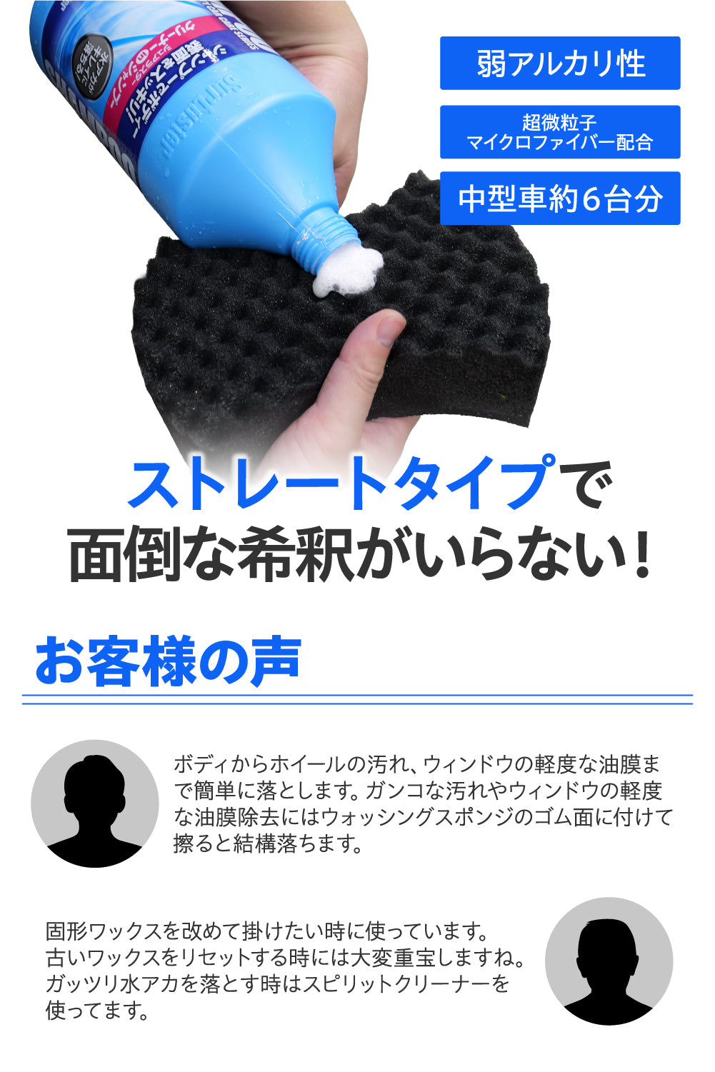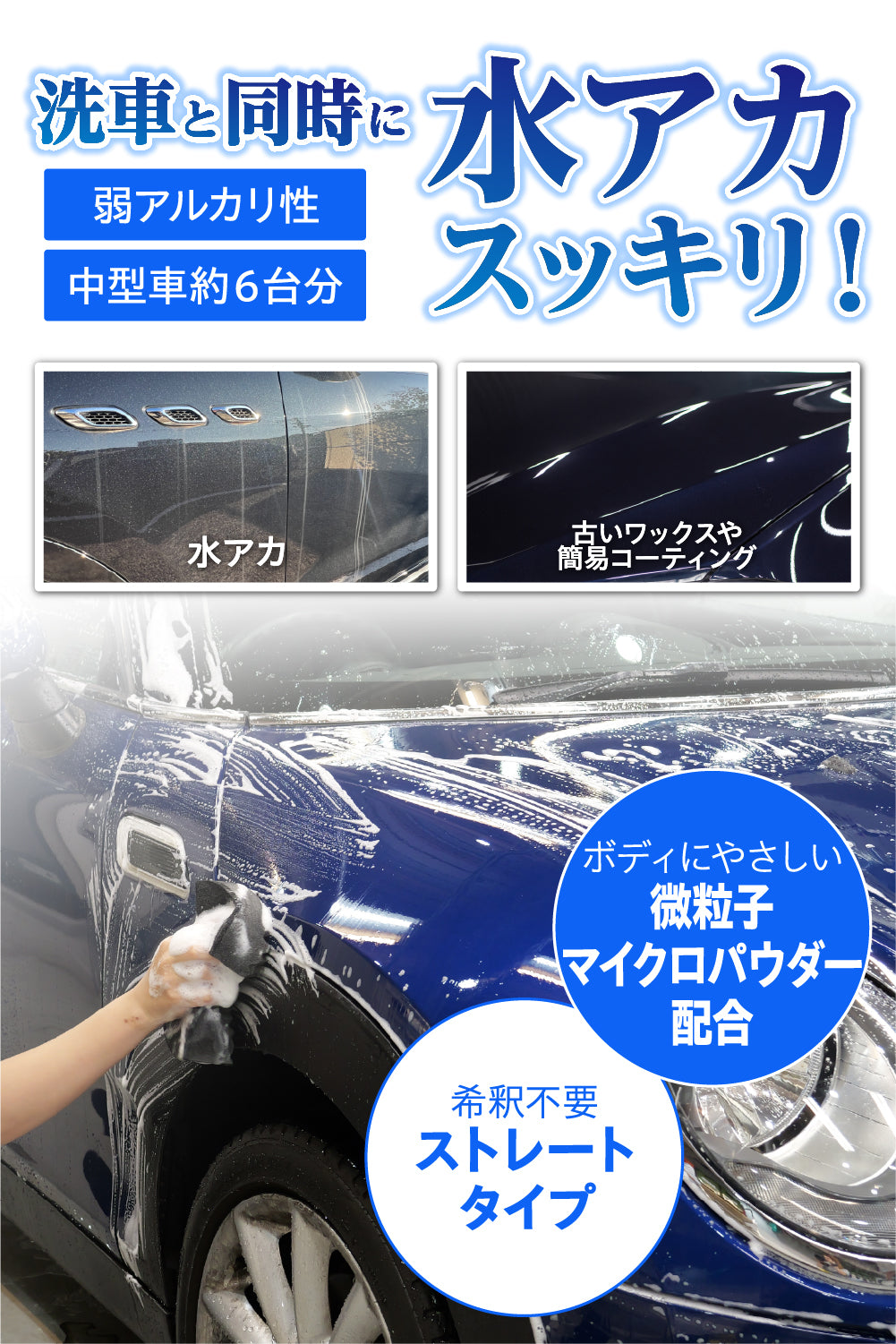 洗車と同時に水アカもスッキリ落とせるクリーナーシャンプー。微粒子マイクロパウダーで、塗装面にやさしく水アカ汚れや虫汚れをしっかり落とします。残ったワックスの除去にも最適です。環境にやさしいキレート剤を配合し、洗浄力もアップ。バンパーなど、樹脂部の汚れにも最適です。