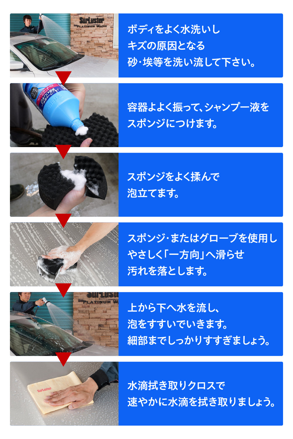 ②容器をよく振ってから、水を含ませた洗車用スポンジに本液を適量取り、よくもんで泡立たせて下さい。