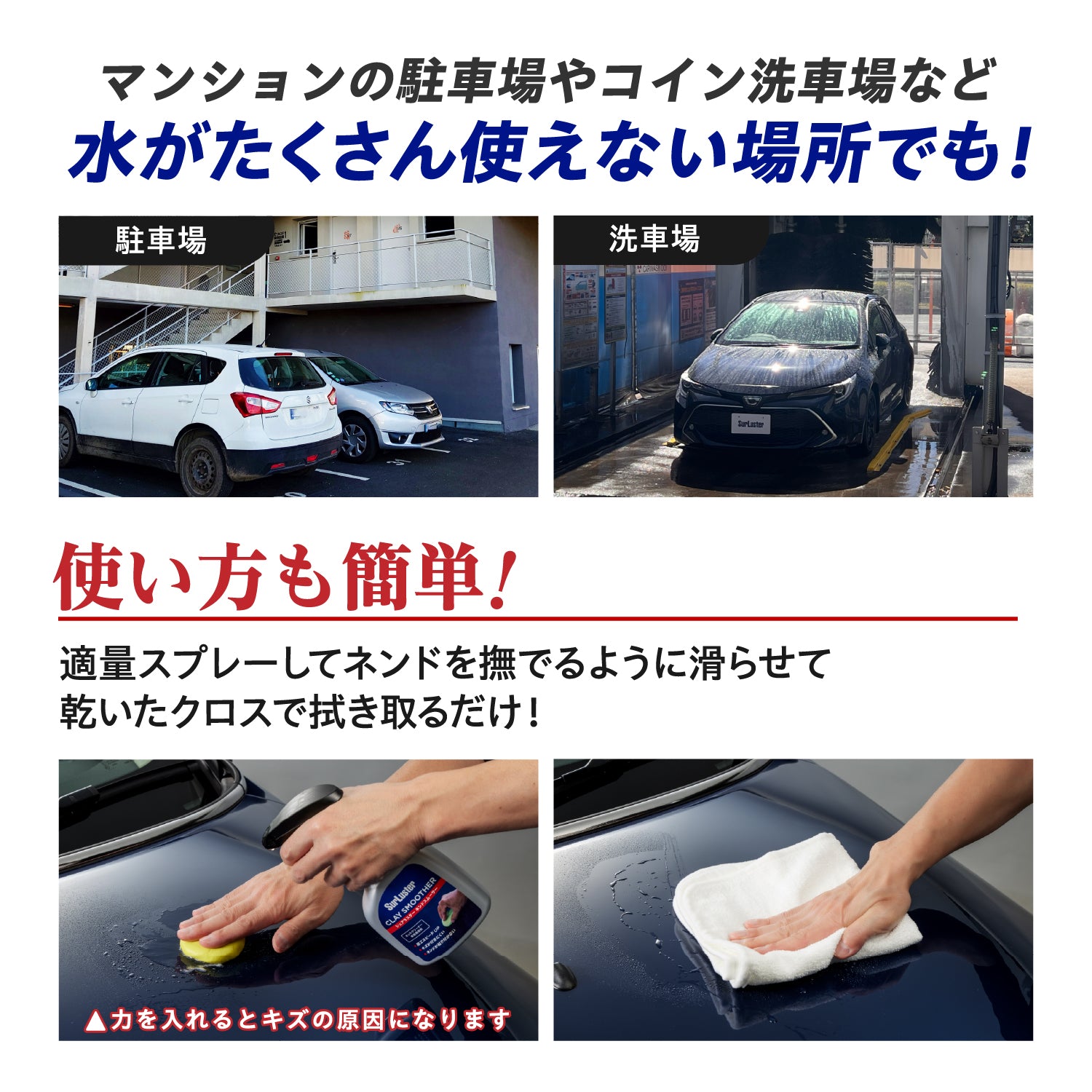ネンドクリーナーの必須アイテム、ついに登場。水を使わずラクラクスピード施工。シュアラスターネンドクリーナー専用潤滑剤。施工時の滑り性が良く、塗面への粘着を防ぎキズもつきにくい。門型洗車機やセルフ洗車機の後など、シャワーを自由に使えないマンションなどの駐車場でも、お手軽簡単ネンド施工が可能!