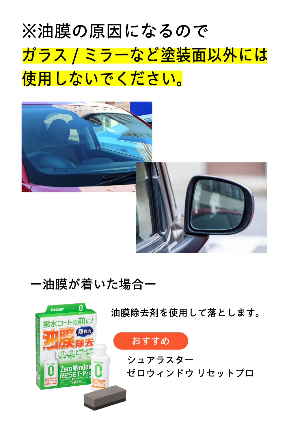 ●油膜の原因になるので、ガラス/ミラー等、塗装面以外には使用しないで下さい。付着した際には、すぐに拭き取って下さい。
